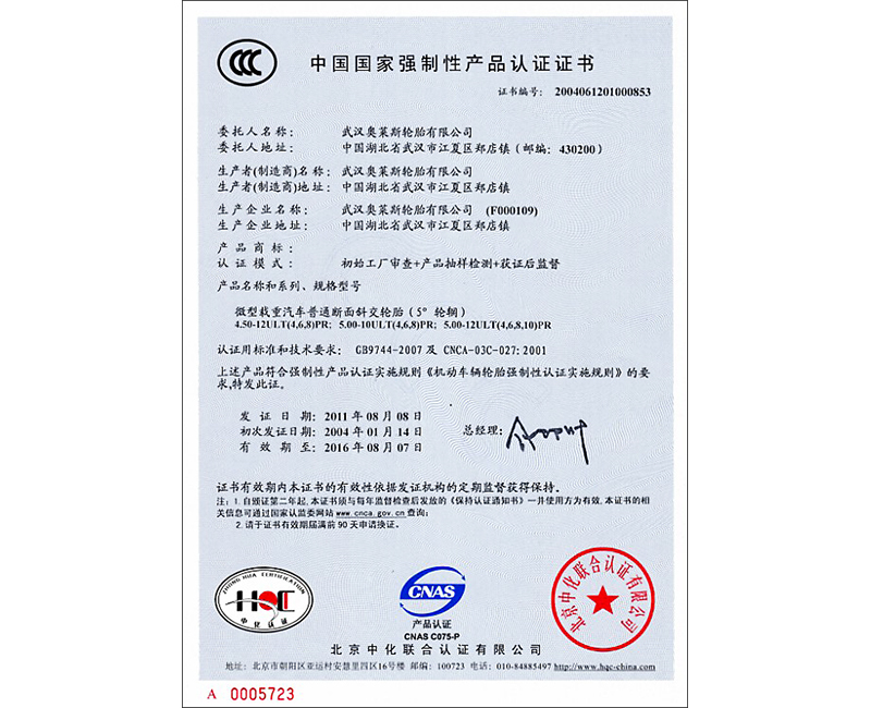 微型載重汽車普通斷面斜交輪胎(5°輪輞)3C認證書